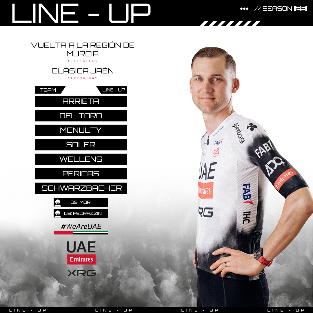 El equipo Emirates-XRG de los Emiratos Árabes Unidos (UAE) comenzará una serie de nueve días de carreras por España y Portugal con un equipo repleto de talentos escaladores en la Vuelta a Murcia el sábado 15 de febrero. Junto a Wellens en su debut de temporada estarán Igor Arrieta e Isaac del Toro, mientras que Marc Soler hará su primera aparición desde el Tour Down Under y Adrià Pericas, Brandon McNulty y Matthias Schwarzbacher seguirán su ejemplo tras sus últimas carreras.