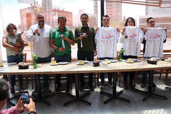 César Simoni Rosas, tesorero de la Asociación Poblana de Atletismo, en representación del presidente José Manuel Vázquez Cabrera, junto al director del Instituto Municipal del Deporte, Antonio Iriarte; Leonardo Pacheco, director operativo de Museos de Puebla, así como Samantha Torres, coordinadora de Mercadotecnia de Grupo La Gran Bodega, Luis Carpintero, propietario de Toscalia y Oscar Díaz, Vicepresidente de la Asociación Poblana de Atletismo, presentaron la medalla y la playera de esta Carrera que de entrada tiene un cambio de sede importante y traslada su salida a la explanada del Museo Internacional del Barroco que se ubica en la Vía Atlixcáyotl.
