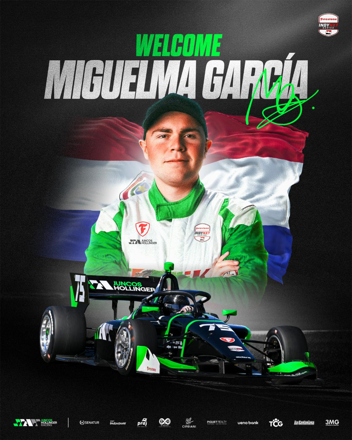 “Es verdaderamente un esfuerzo que cambia la vida y un privilegio contar con el apoyo de la mesa de inversiones y comercio de la región India Mena en Paraguay. Su apoyo es lo que hace posible unirme a Juncos Hollinger Racing para la próxima temporada 2025 de Indy NXT y más allá. Me gustaría agradecer a Ricardo Juncos por su confianza y creer en mí para lograr esto. También me gustaría agradecer a Brad Hollinger por darme la bienvenida con los brazos abiertos a JHR. Trabajaremos juntos para hacer de 2025 el mejor año de mi carrera hasta la fecha ”, comparte MiguelMa García, piloto del auto #75 INDY NXT.