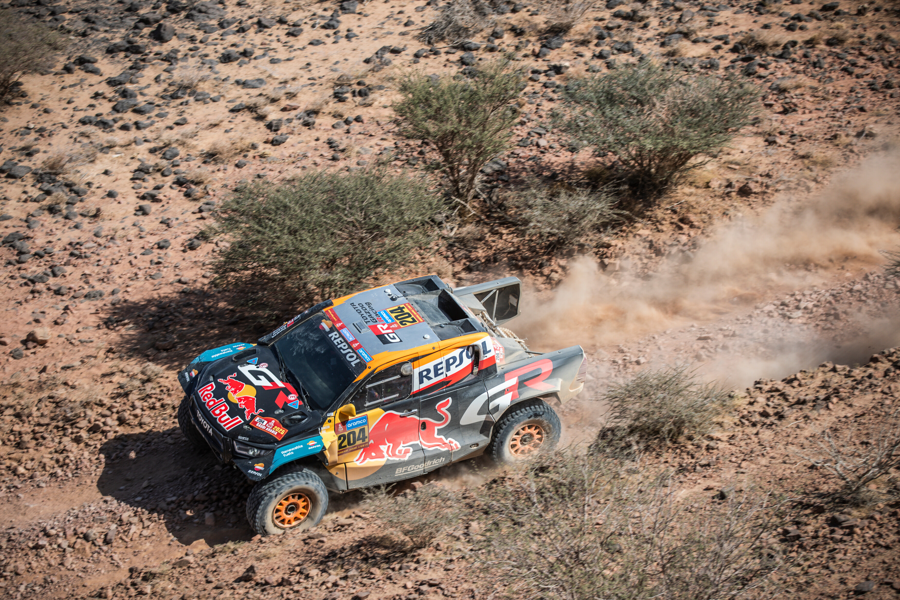 – El qatarí colocó su Dacia Sandrider en el tercer puesto de la clasificación general, a 11 minutos y 14 segundos del líder de la clase Ultimate, Henk Lategan, mientras que su compañero de equipo Sébastien Loeb luchó contra un problema de sobrecalentamiento para terminar con fuerza y terminar a menos de 20 minutos del sudafricano. Al-Attiyah, de 54 años, dijo: “Hemos pinchado un neumático en los últimos 50 km y también hemos tenido un problema con la dirección asistida. Ha sido complicado superar esta etapa con todo el polvo”.