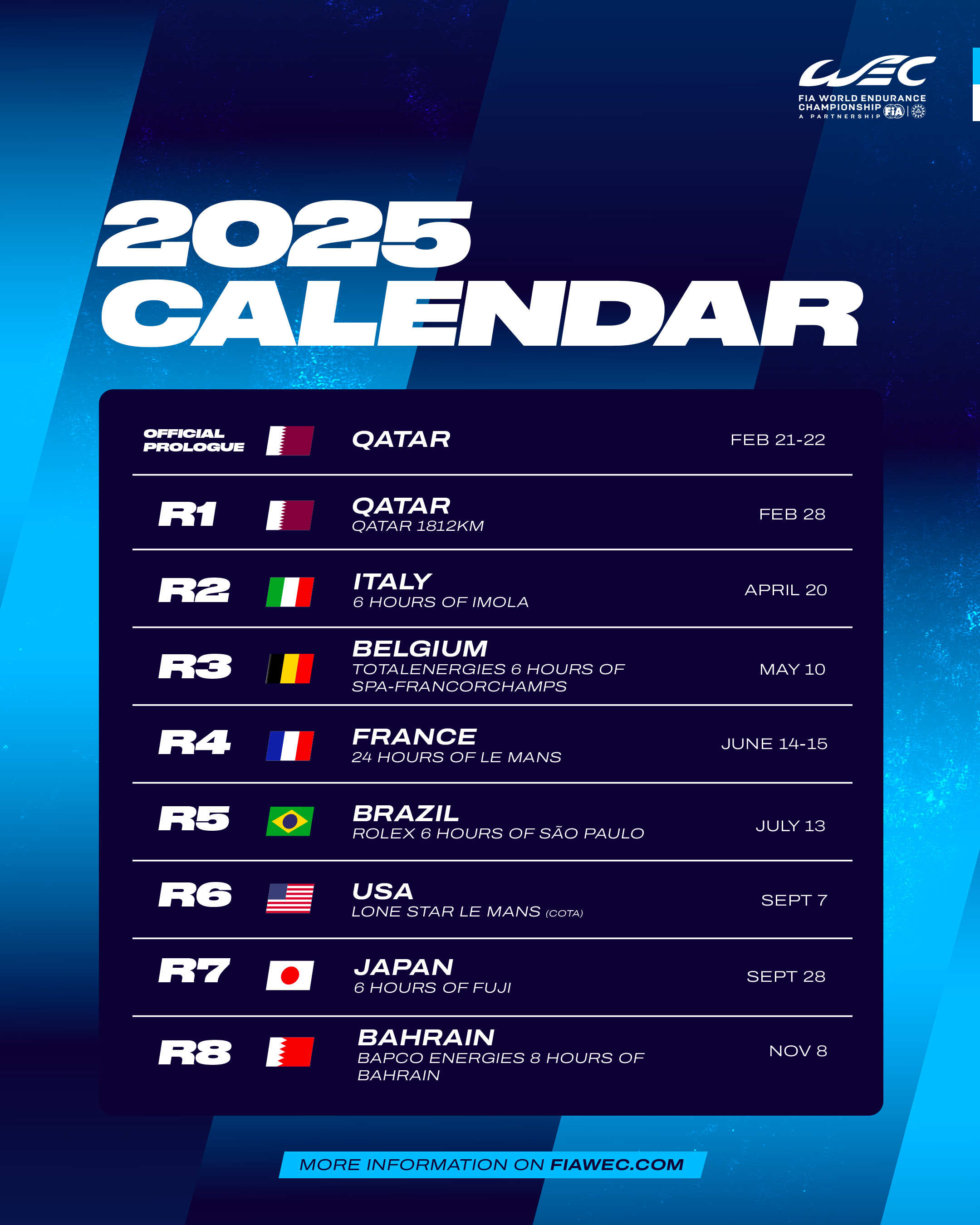 Se espera que un mínimo de 14 fabricantes compitan en el WEC el próximo año, que comenzará en Doha, Qatar, en febrero de 2025. El Circuito Internacional de Lusail volverá a albergar el Prólogo del WEC (pruebas de pretemporada) y los 1.812 km de Qatar, que inauguran la temporada. lleva el nombre del Día Nacional del país, el 28 de febrero de 2025.